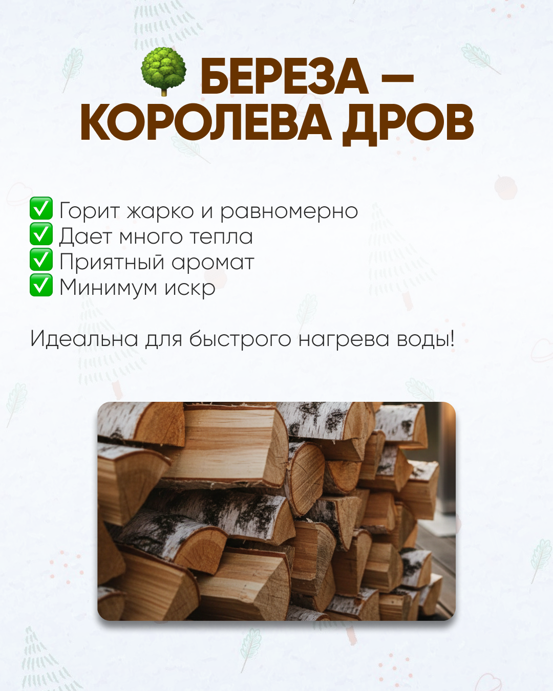 - Береза: Дает максимальную теплоотдачу. Идеальна для зимнего использования.