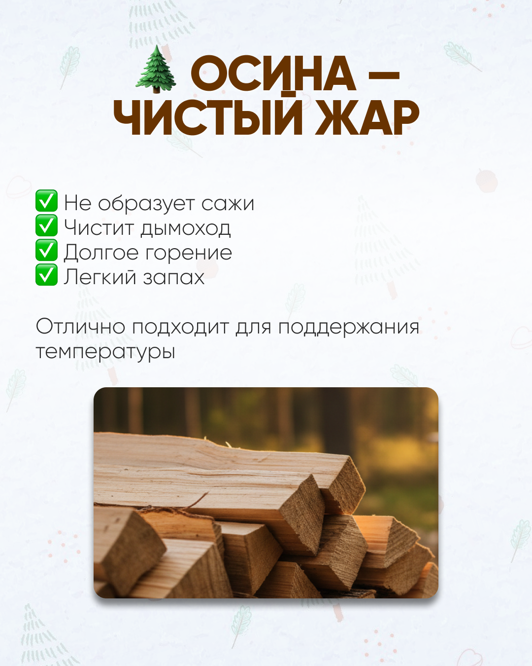 - Осина: Содержит вещества, выжигающие сажу. Рекомендуется для профилактики дымохода.