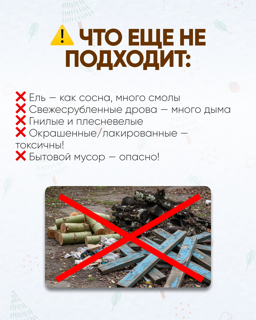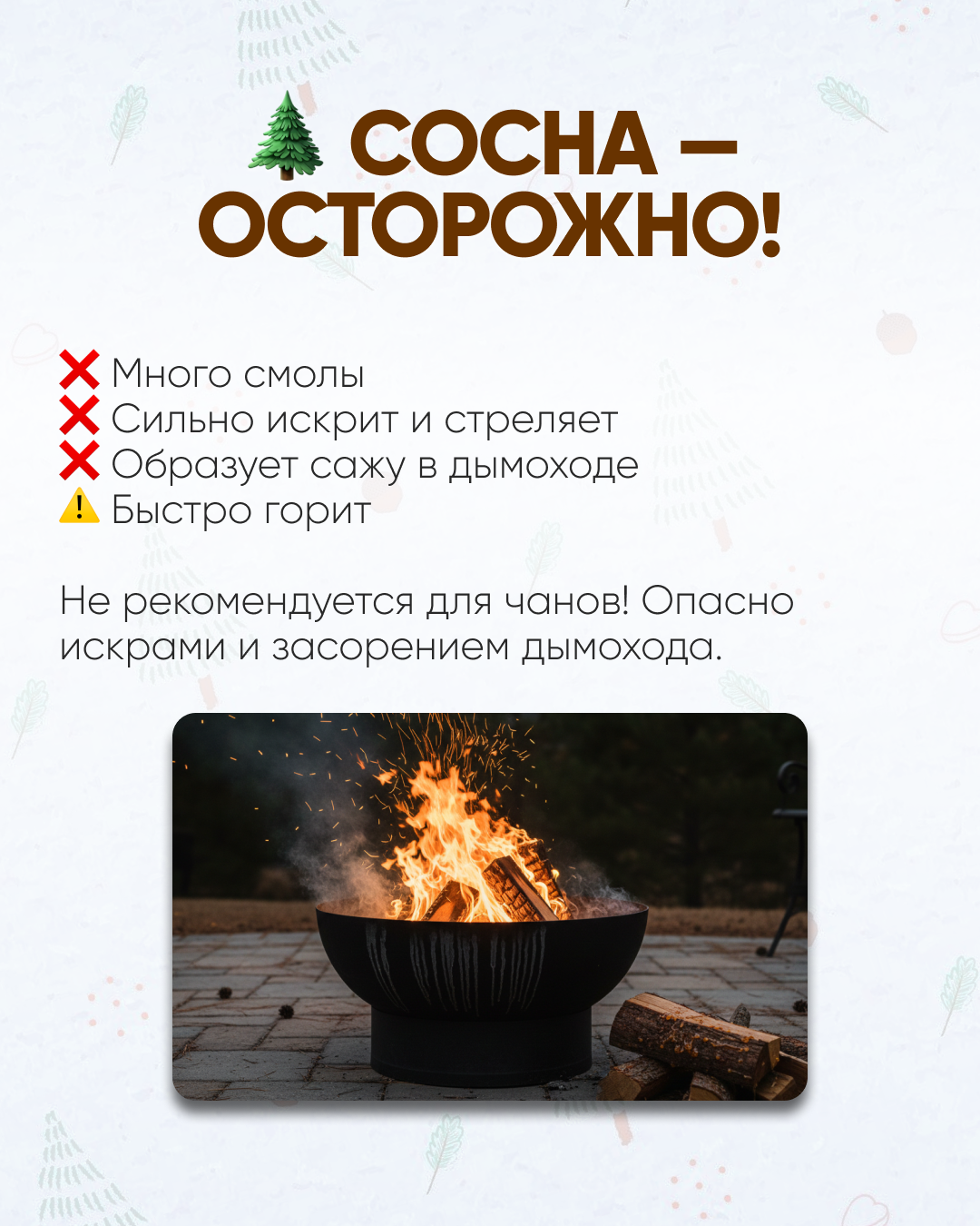 Хвойные породы (сосна, ель) содержат много смолы. При сгорании она оседает на стенках топки и дымохода, создавая пожароопасный налет. Кроме того, хвоя сильно «стреляет» искрами.