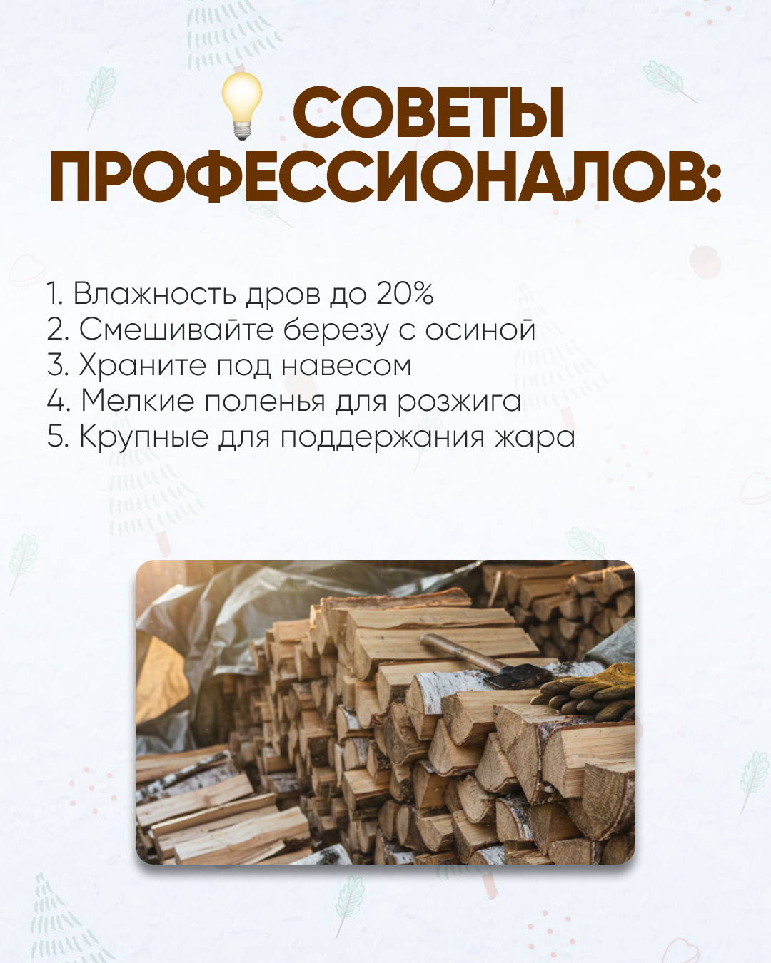 Влажность дров не должна превышать 20%. Сырое дерево забирает энергию на испарение воды, снижая КПД печи. Храните поленницу под навесом с продувом.