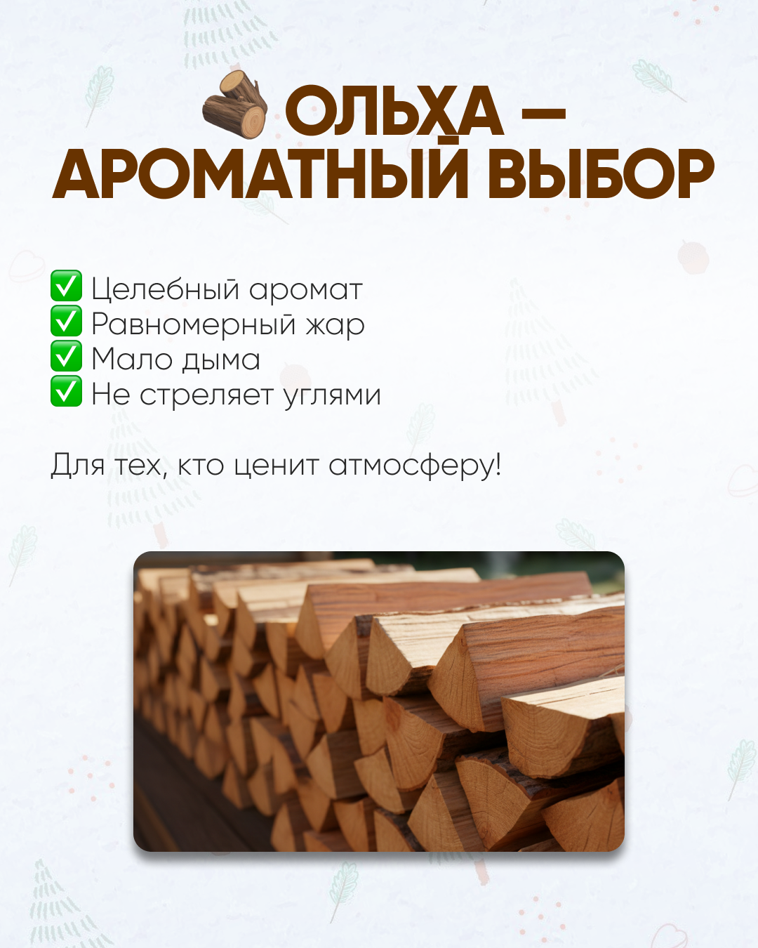 - Ольха: Горит ровно, без дыма. Подходит для чувствительных к запахам людей.