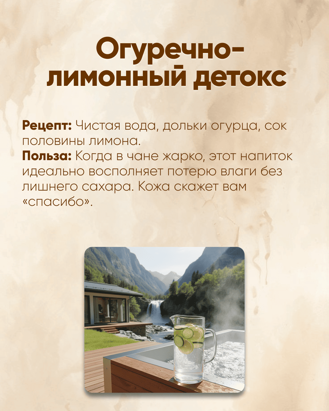 При парении в купели организм активно выводит токсины через поры. Чтобы этот процесс проходил мягко, важно поддерживать водный баланс. Мы рекомендуем отказаться от сладких газировок и алкоголя в пользу натуральных составов.