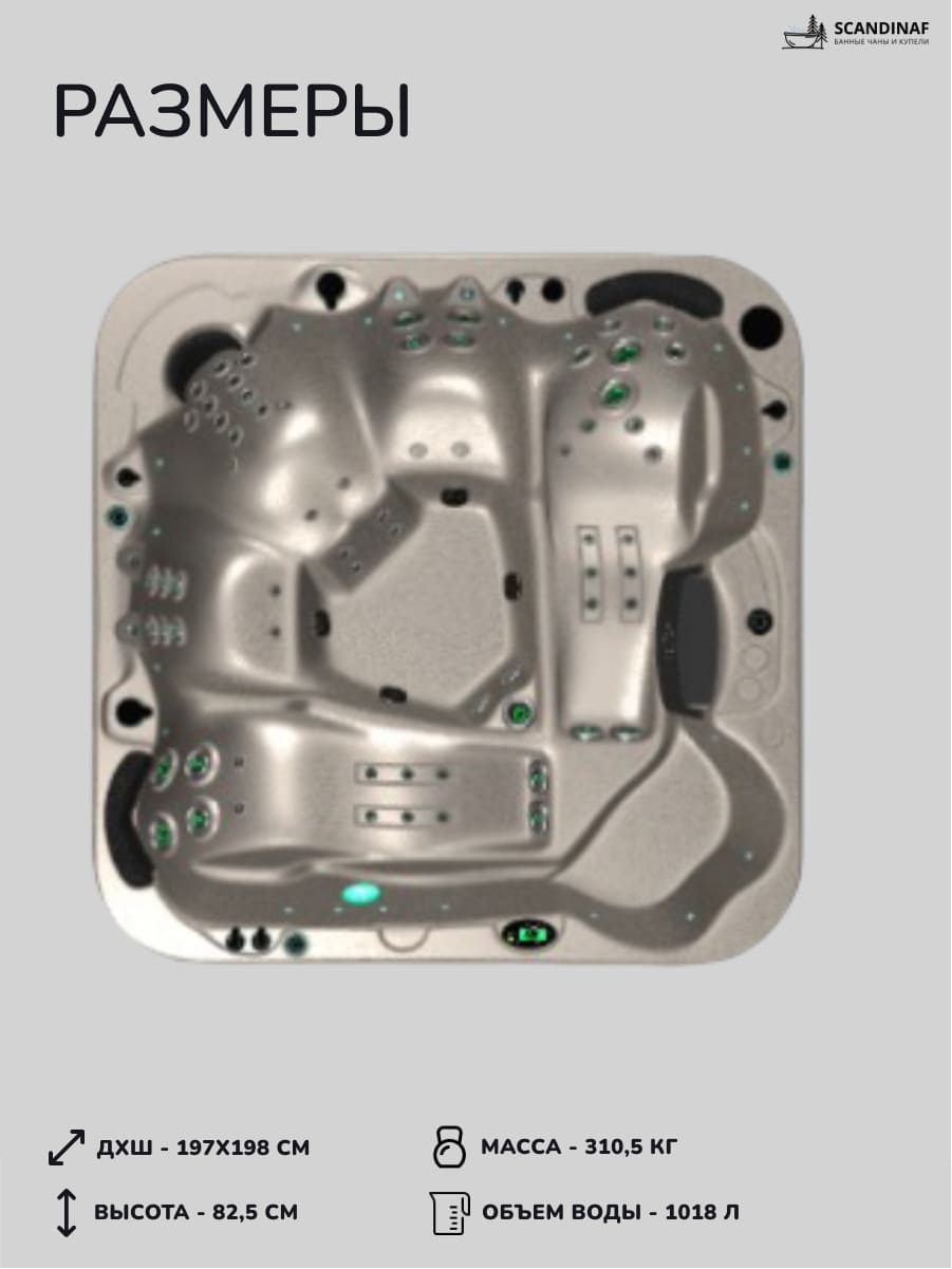 - Уникальный Функционал: Для максимального комфорта предусмотрены такие элементы, как подсветка по периметру, верхнее контрольное освещение, подсветка подстаканников и ламинарные форсунки с подсветкой, создающие расслабляющую атмосферу СПА.