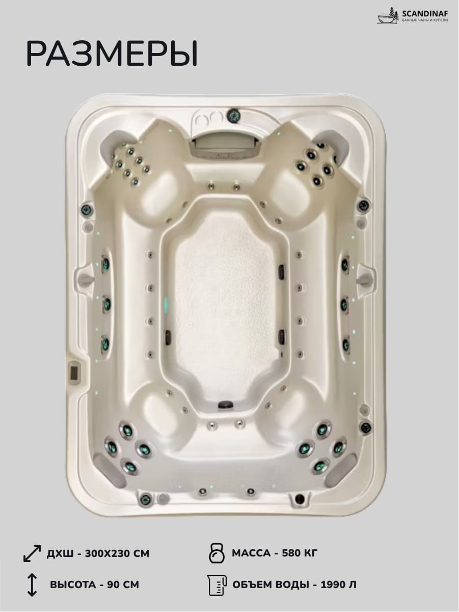 - Уникальный Функционал: Для максимального комфорта предусмотрены такие элементы, как подсветка по периметру, верхнее контрольное освещение, подсветка подстаканников и ламинарные форсунки с подсветкой, создающие расслабляющую атмосферу СПА.
