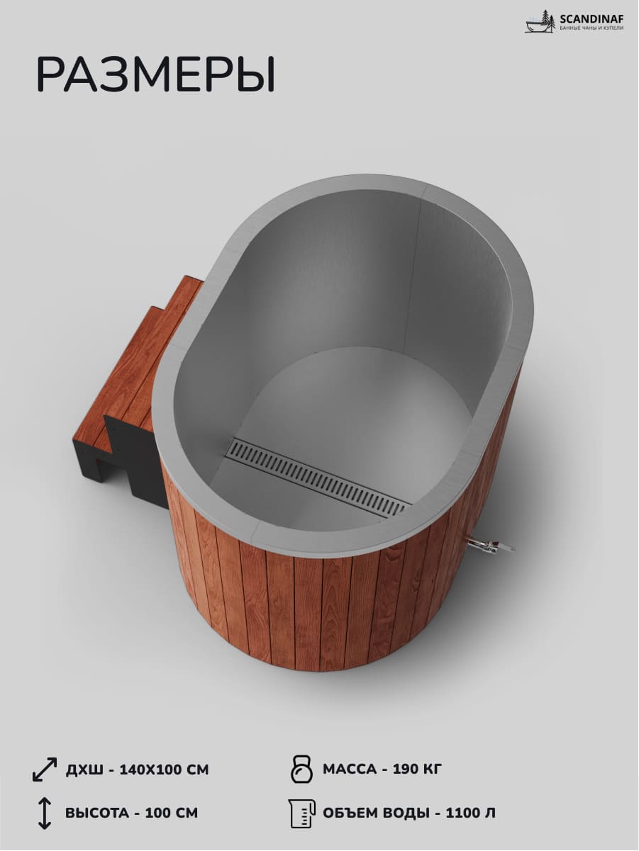 Окантовочная доска по периметру, а также сидушки и лестница выполнены из термососны. Данное дерево хорошо переносит влажность и постоянное нахождение в воде, не рассыхается и не гниет, а также обладает приятным ароматом.