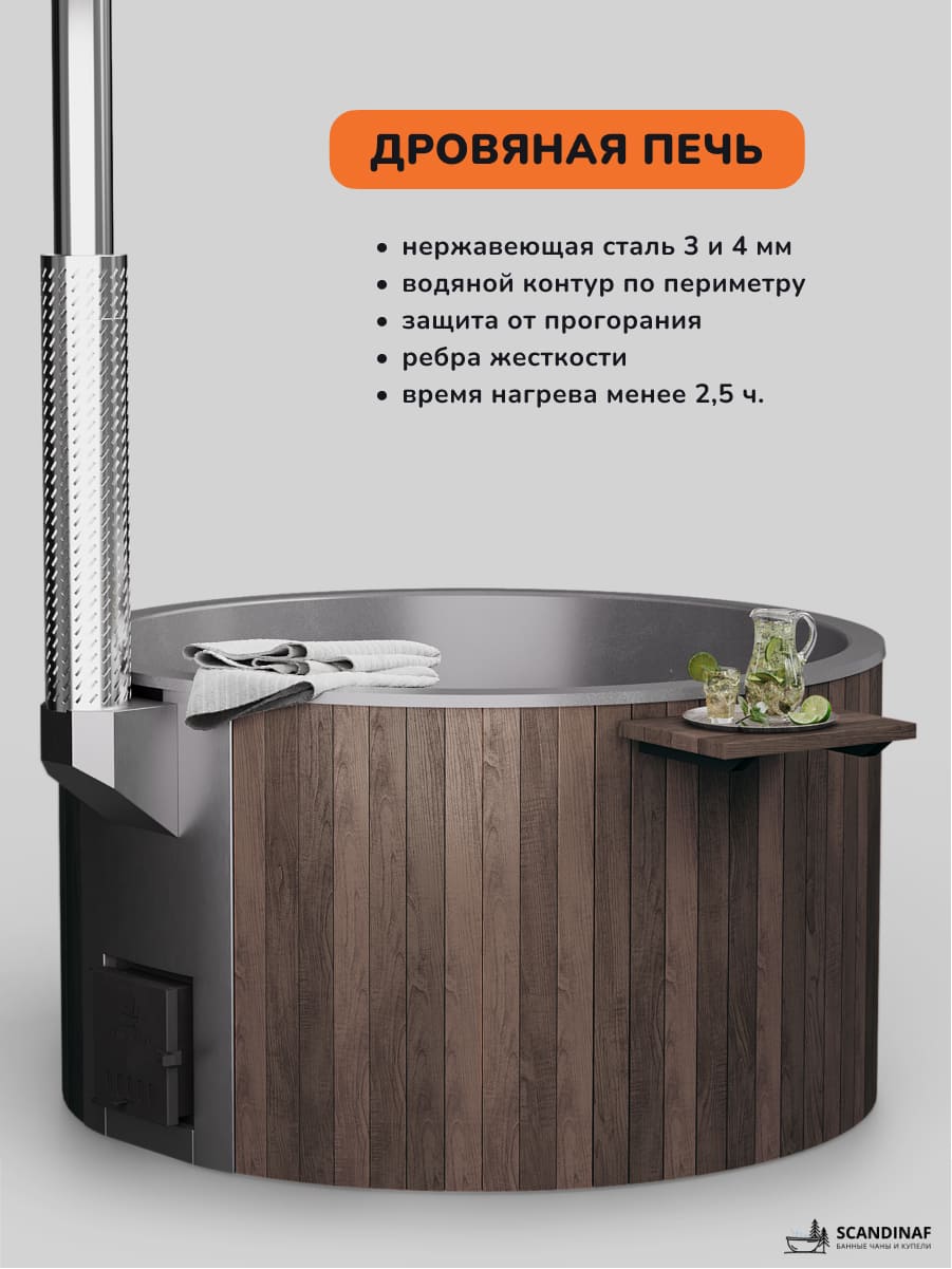 Купель на дровах SCANDINAF – это премиальная уличная купель, созданная для максимально комфортного отдыха и парения на вашем участке круглый год.